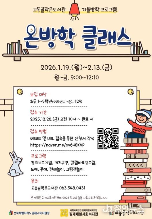 정안뉴스 안정주 기자 | 김제시는 교동골작은도서관이 겨울방학을 맞아 아동을 위한 특별 프로그램인 ‘온(溫)방학 클래스’를 운영한다고 밝혔다.