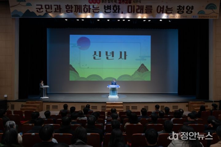 정안뉴스 황도연 기자 | 청양군은 지난 2일 문예회관 대강당에서 전 직원 400여 명이 참석한 가운데 2026년 병오년 새해 시무식을 개최하고, 새해 군정 운영 방향을 공유하며 힘찬 출발을 다짐했다.