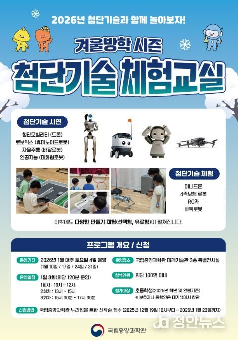 정안뉴스 안정주 기자 | 과학기술정보통신부 국립중앙과학관은 겨울방학을 맞이하여 2026년 1월 중 매주 토요일 4일(10일, 17일, 24일, 31일) 동안'겨울방학 시즌 첨단기술 체험교실'을 국립중앙과학관 미래기술관 3층에서 운영한다고 밝혔다.