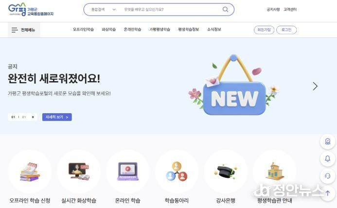 정안뉴스 안정주 기자 | 가평군이 올해부터 군민 모두가 함께 배우고 성장하는 평생학습도시 조성을 목표로 평생학습 홈페이지를 전면 개편해 새롭게 운영한다. 온라인 기반 학습 환경을 강화하고 교육 참여 기회를 확대하기 위한 조치다.