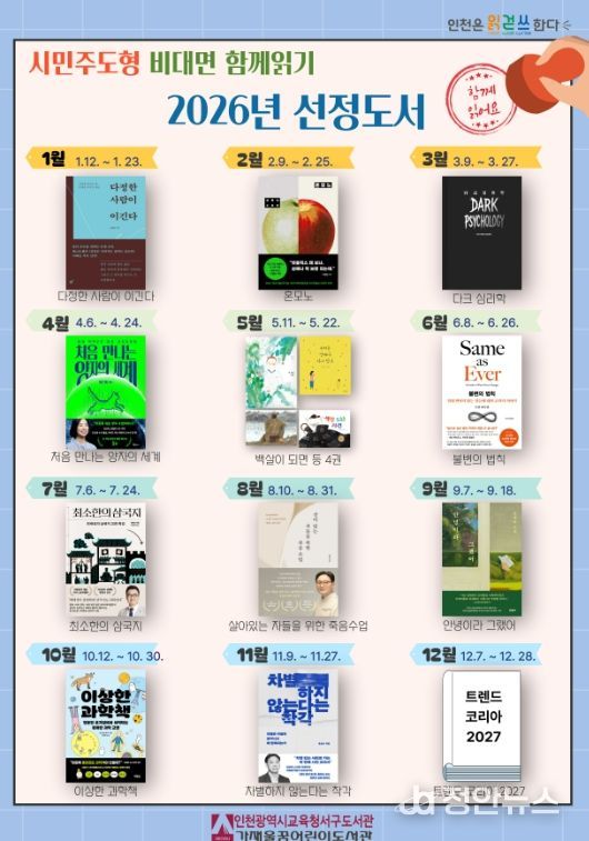 정안뉴스 안정주 기자 | 인천광역시교육청서구도서관은 12월 31일 ‘2026년 시민주도형 비대면 함께읽기’ 도서 15권을 선정·발표했다.