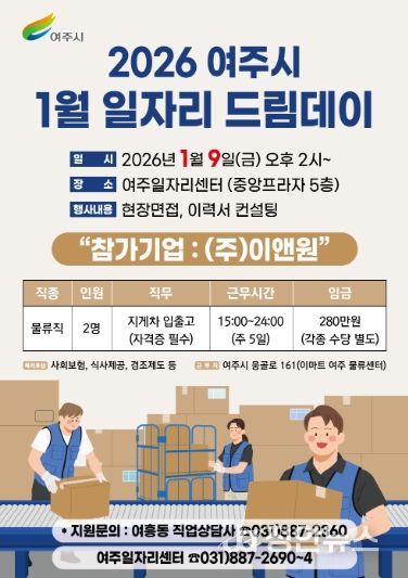 정안뉴스 안정주 기자 | 여주시는 오는 1월 9일 오후 2시 여주일자리센터(세종로 14번길 18, 중앙프라자 5층)에서 ‘2025년 첫 여주시 일자리드림데이’를 연다.