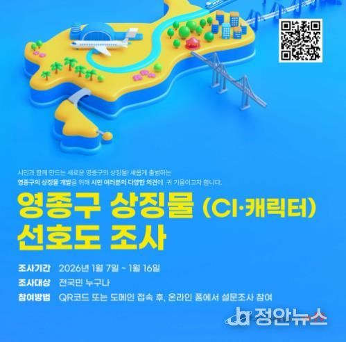 정안뉴스 안정주 기자 | 인천시 중구는 올해 7월 출범할 ‘영종구’의 정체성과 지역 이미지를 담은 영종구 상징물(CI, 캐릭터) 선정을 위해 선호도조사를 실시한다고 6일 밝혔다.