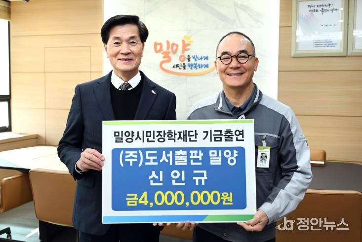 정안뉴스 김재홍 기자 | (재)밀양시민장학재단은 6일 ㈜도서출판 밀양으로부터 장학기금 400만원을 기탁받았다.