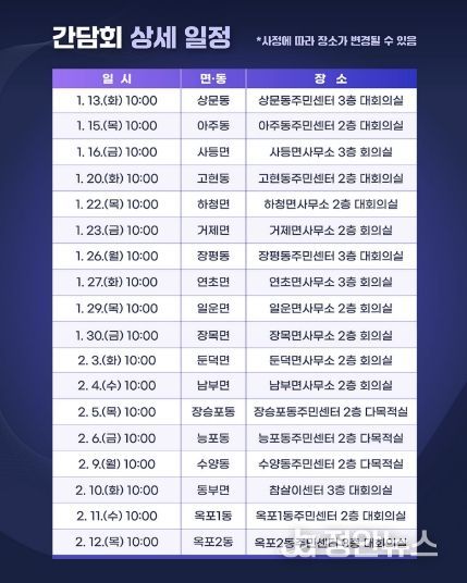 정안뉴스 김재홍 기자 | 거제시는 오는 13일 상문동을 시작으로 한 달간 2026년 면‧동 순방(시민공감 간담회)을 실시한다.