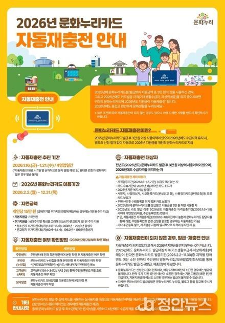 정안뉴스 안정주 기자 | 인천문화재단은 2026년 1월 16일부터 1월 21일까지 문화누리카드 지원금이 자동으로 재충전된다고 밝혔다.