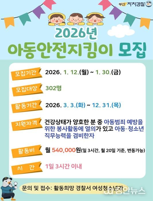 정안뉴스 황정혜 기자 | 부산시 자치경찰위원회는 부산경찰청과 함께 오는 1월 12일부터 1월 30일까지 '2026년 아동안전지킴이'를 모집한다고 밝혔다.