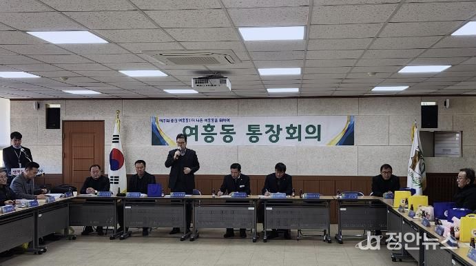 정안뉴스 안정주 기자 | 여주시 여흥동은 8일 오전, 행정복지센터 2층 회의실에서 2026년 새해를 맞이하며 첫 통장회의를 개최했다. 회의에는 김영완 여흥동장, 박두형 여주시의회 의장, 서광범 도의원, 이병길 여주농협조합장 및 33개 마을 통장이 참석했다.