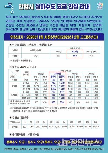 정안뉴스 안정주 기자 | 안양시는 상하수도 생산원가 상승과 노후 시설 정비를 위한 대규모 투자 재원 확보를 위해 2026년 1월 사용분(2월 고지분)부터 상하수도 요금을 인상한다고 11일 밝혔다. 이번 인상은 고물가 상황 속에서 시민들의 경제적 부담을 최소화하기 위한 ‘단계적 현실화 계획’에 따른 것이다.