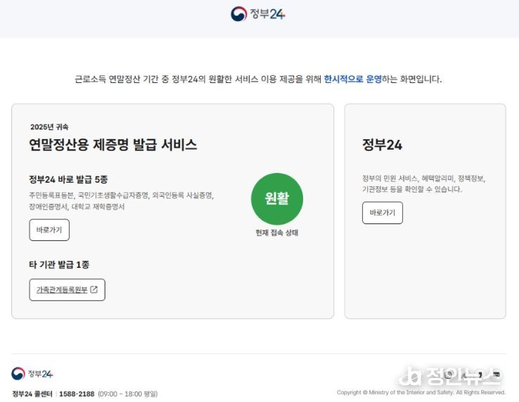 행정안전부는 연말정산 기간에 이용자 접속이 급증할 것에 대비해 전용창구를 운영하고, 접속 폭주 시 순번 대기 표시기능을 적용하는 등 이용자 불편을 최소화하여 정부24 운영의 안정성을 높인다는 계획이다.