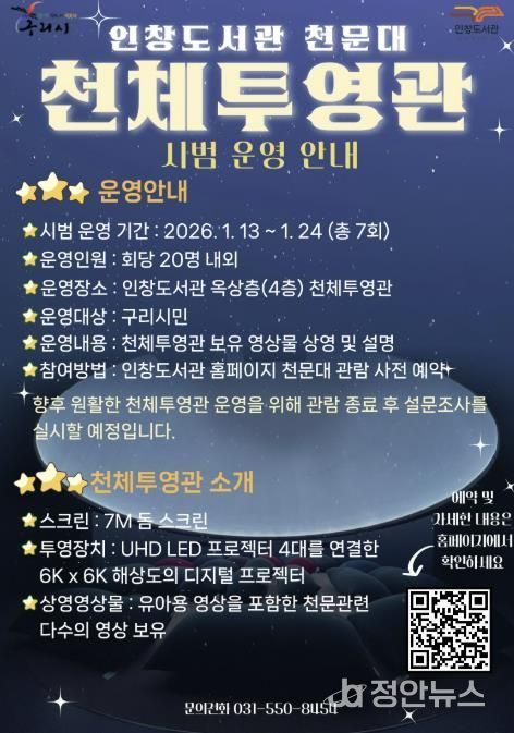 정안뉴스 안정주 기자 | 구리시는 오는 1월 13일부터 24일까지 인창도서관 옥상에 설치된 천체투영관의 시범운영을 실시한다고 밝혔다.