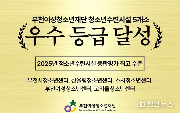 정안뉴스 안정주 기자 | 부천여성청소년재단이 청소년수련시설 5개소(부천시청소년센터, 산울림청소년센터, 소사청소년센터, 부천여성청소년센터, 고리울청소년센터)가 성평등가족부 주관 2025년 청소년수련시설 종합평가에서 5개 시설 모두 최고 수준인 ‘우수’ 등급을 달성하는 쾌거를 이루었다.
