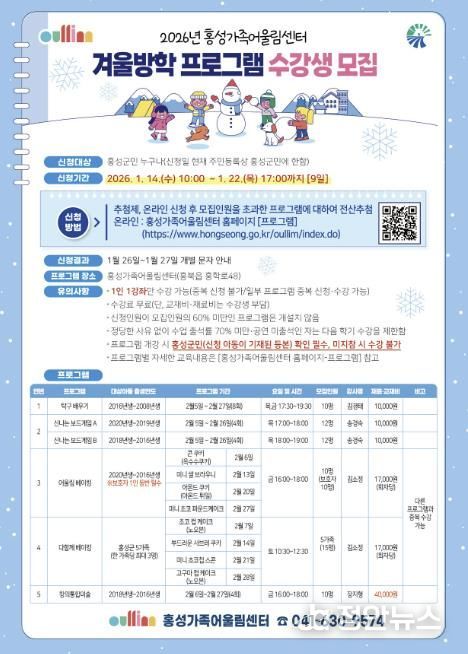 정안뉴스 황도연 기자 | 홍성가족어울림센터는 관내 유아 및 초·중·고등학생을 대상으로 2026년 겨울방학 프로그램 수강생을 모집한다. 이번 프로그램은 놀이 중심의 체험형 교육을 강화하고, 보호자와 함께 참여할 수 있는 수업을 포함해 가족이 함께 즐길 수 있는 문화 활동으로 구성됐다.