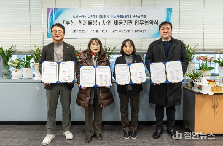 정안뉴스 황정혜 기자 | 부산 부산진구는 지난 12일 ▲부산진시니어클럽 ▲부산진지역자활센터 ▲한국치매돌봄협동조합과 ‘부산, 함께돌봄’ 사업의 상호협력체계 구축을 위한 업무협약을 체결했다.
