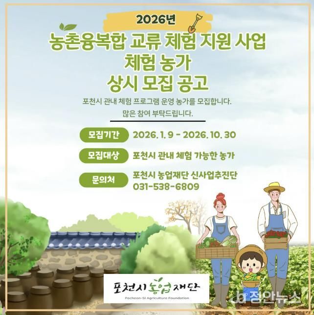 정안뉴스 안정주 기자 | 포천시농업재단은 13일 체험농가의 농외소득 창출과 농촌 체험 활성화를 위해 ‘2026년 농촌융복합 교류 체험 지원 사업’을 추진한다고 밝혔다.
