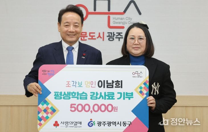 정안뉴스 안정주 기자 | 광주 동구는 평생학습관에서 조각보 포장 강사로 활동한 이남희 씨가 강사료 일부를 기부하며 지역사회에 따뜻한 나눔을 전했다고 밝혔다.