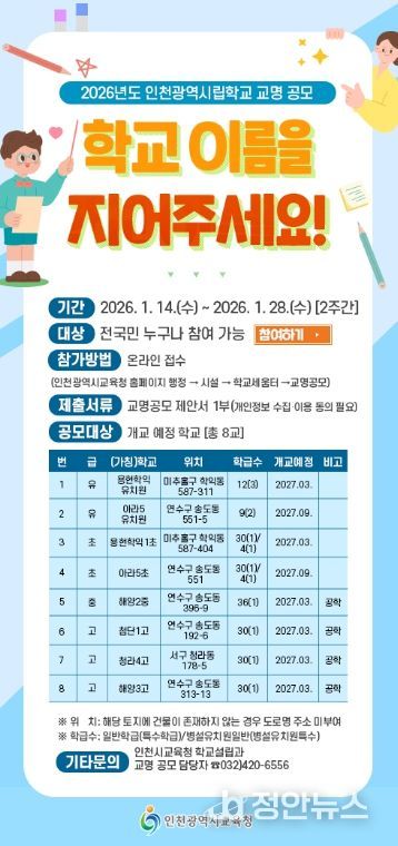 정안뉴스 안정주 기자 | 인천광역시교육청은 1월 14일부터 28일까지 2주간 신설학교 8교의 명칭을 공모한다.