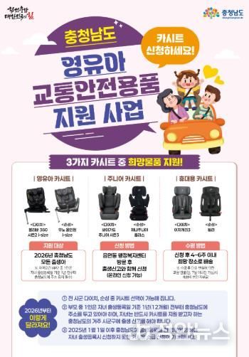 기존에는 당해연도 관내에 출생신고를 한 신생아를 대상으로 영유아, 주니어, 휴대용 카시트 중 선택한 1개를 지원했으나, 올해부터는 충남도 내 거주요건 강화 및 카시트 제조사를 선택할 수 있도록 바뀌었다.