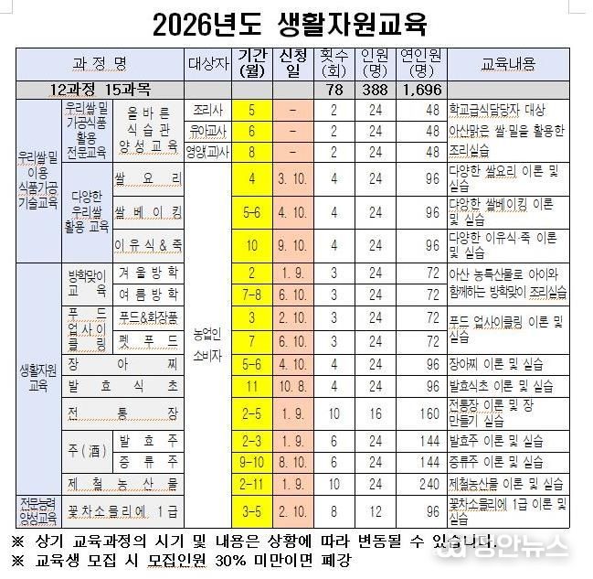 이미용 농촌자원과장은 “올해 생활자원교육은 단순한 실습을 넘어 시민의 삶에 실질적인 도움이 되는 교육이 되도록 계획했다”며, “다양한 교육과정을 통해 많은 시민들이 농촌자원의 가치를 체감하길 바란다”고 말했다.