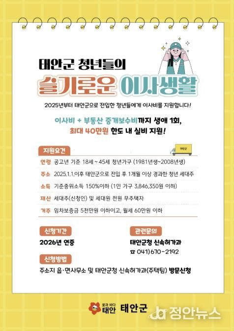 정안뉴스 황도연 기자 | 태안군이 청년들의 초기 주거 부담을 낮춰 인구 유입을 활성화하고자 ‘2026년 청년 이사비 지원사업’을 추진하며 청년인구 사수에 나선다.