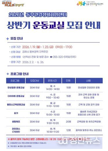 정안뉴스 김재홍 기자 | 김해시 동부건강생활지원센터는 지역주민의 만성질환예방 및 건강증진을 위해 19일부터 1월 23일까지 '26년 상반기 운동교실' 참여자를 모집한다고 밝혔다.