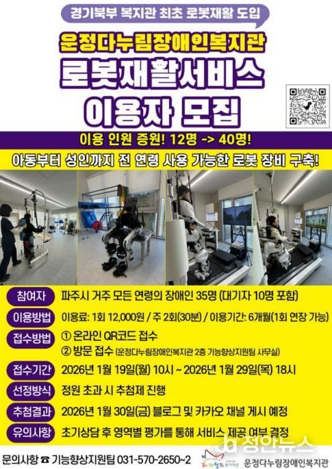 2025년 9월 개관한 운정다누림장애인복지관은 경기북부 최초로 최첨단 로봇 재활 장비인 지면 보행형 로봇 재활 훈련 장치(워크봇)와 웨어러블 로봇을 도입해 운영하고 있다. 이를 통해 뇌병변·발달·지체장애 등으로 보행에 어려움을 겪는 장애인을 대상으로 로봇 기반 보행훈련을 제공하며 올바른 보행유형 형성과 근신경 재교육을 체계적으로 지원하고 있다.