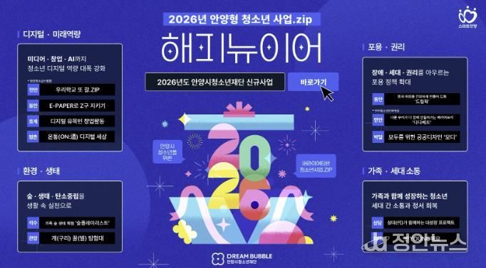 정안뉴스 안정주 기자 | 안양시청소년재단은 2026년을 맞아 ‘청소년이 주도하는 변화의 물결, 모두가 함께하는 지속 가능한 미래’라는 비전 아래 10개 소속 기관을 주축으로 신규사업을 본격 추진한다.