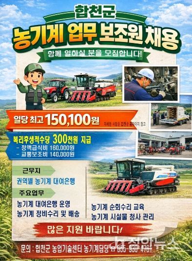 정안뉴스 김재홍 기자 | 합천군은 농기계대여은행 운영체계를 강화하고 농업인 영농 편의를 높이기 위해 2026년 농기계 업무보조원 기간제근로자 9명을 채용한다고 14일 밝혔다.