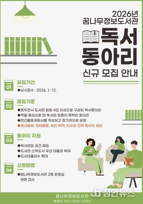 정안뉴스 안정주 기자 | 동두천시 도서문화사업소 꿈나무정보도서관은 시민들의 인문적 사고력 향상과 토론 문화 활성화를 위해 2026년 신규 독서동아리를 모집한다고 밝혔다.
