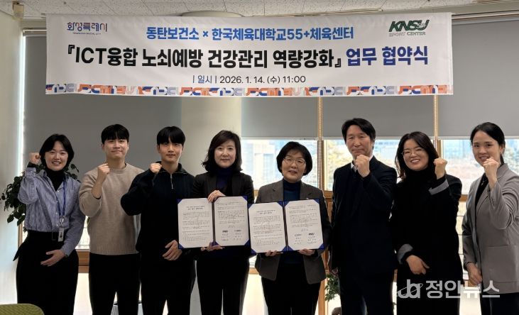 정안뉴스 안정주 기자 | 화성시동탄보건소는 14일 한국체육대학교 학교기업 55+체육센터와 ‘인공지능(AI)·사물인터넷(IoT) 기반 어르신 건강관리사업과 연계한 노쇠 예방 및 신체활동 증진 프로그램 추진을 위한 업무협약’을 체결했다.
