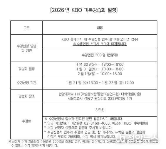 정안뉴스 안정주 기자 | 2026년 KBO 기록강습회가 1월 30일(금)부터 2월 1일(일)까지 서울 한양대학교에서 개최된다. 기록강습회는 야구 공식기록법의 보급과 이해를 통한 저변 확대를 목적으로 프로야구 원년인 1982년부터 개최됐다.