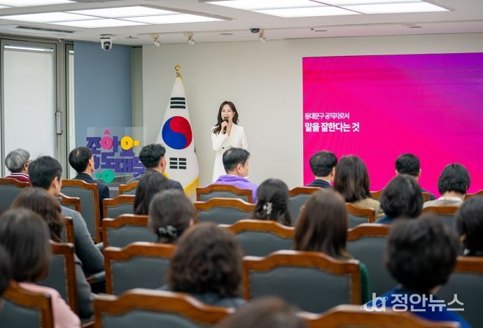 정안뉴스 안정주 기자 | 서울 동대문구는 14일 구청 5층 기획상황실에서 구청장과 6급 팀장 이상 관리자를 대상으로 ‘스피치 역량 강화 특강’을 열었다. 정책 설명과 내부 소통, 대민 응대 등 행정 현장에서 관리자의 말 한마디가 곧 조직의 신뢰로 이어지는 만큼, 공적 커뮤니케이션의 기본기를 점검하고 현장 적용력을 끌어올리기 위한 자리였다.