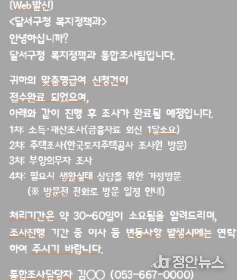 정안뉴스 안정주 기자 | 대구 달서구는 맞춤형 복지급여(생계·의료·주거·교육) 신청인을 대상으로 조사 진행 상황을 안내하는 ‘알림톡 서비스’를 2026년에도 확대 시행한다.