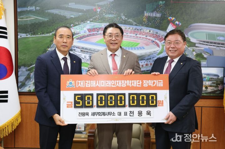 정안뉴스 김재홍 기자 | 김해시미래인재장학재단은 15일 천용욱 세무회계사무소에서 올해부터 5년간 5,000만원을 기탁하기로 했다고 밝혔다.