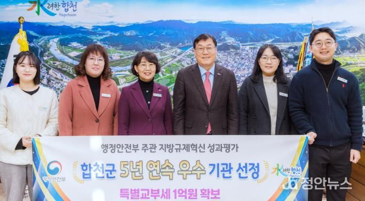 정안뉴스 김재홍 기자 | 합천군은 행정안전부가 주관하는 ‘2025년 지방규제혁신 추진 성과평가’에서 우수기관으로 선정, 특별교부세 1억원 확보하는 쾌거를 달성했다고 15일 밝혔다.