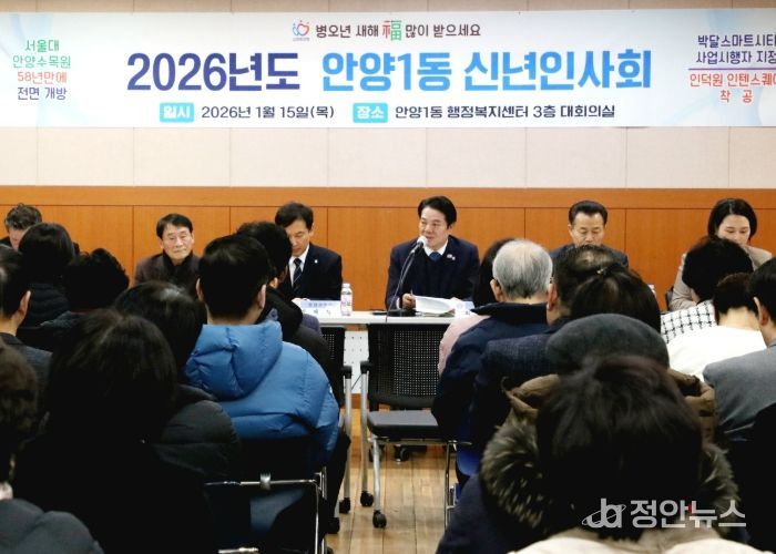 정안뉴스 안정주 기자 | 안양시는 이달 15일 안양1동을 시작으로 내달 10일까지 31개 동의 주민들과 함께하는 ‘2026년 동 신년인사회’를 개최한다고 밝혔다.