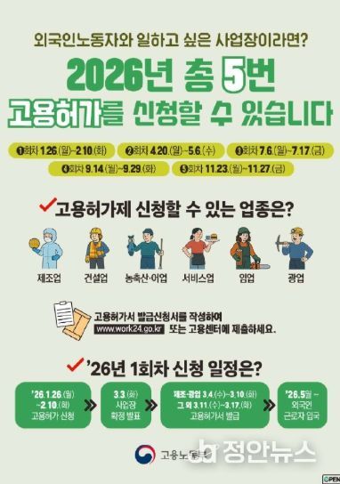 정안뉴스 안정주 기자 | 고용노동부는 구인난을 겪는 기업이 이주노동자(E-9)를 고용할 수 있도록 ‘26년도에도 5차례 신규 고용허가 신청․접수를 진행할 예정이라고 밝혔다.