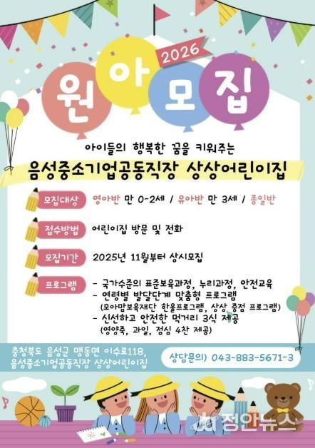 정안뉴스 황은경 기자 | 음성군은 중소기업 근로자의 보육환경 개선과 일·가정 양립 문화 확산을 위해 운영 중인 중소기업 공동직장어린이집 ‘상상어린이집’의 원아를 모집한다.