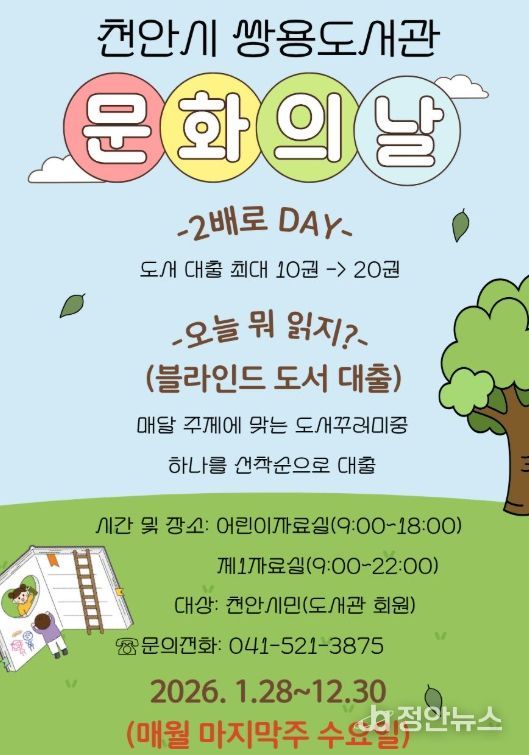 정안뉴스 황도연 기자 | 천안시 쌍용도서관은 매달 마지막주 수요일 ‘2026 문화가 있는 날’ 행사를 운영한다고 16일 밝혔다.