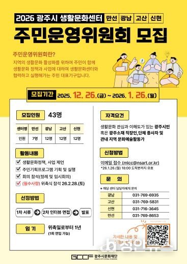 정안뉴스 안정주 기자 | (재)광주시문화재단은 광주시 생활문화센터(만선·광남·고산·신현)에서 2026년에 활동할 주민운영위원회 위원을 통합 공개 모집한다고 밝혔다.