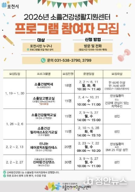정안뉴스 안정주 기자 | 포천시 소흘건강생활지원센터는 시민들의 건강 증진과 활기찬 일상 지원을 위해 오는 19일부터 ‘2026년 상반기 건강증진 프로그램’ 참여자를 모집한다.