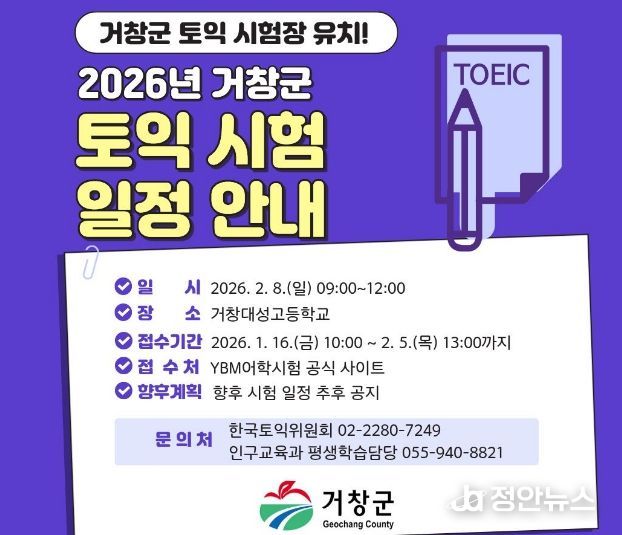 군은 2026년부터 거창대성고등학교를 토익시험장으로 운영함에 따라, 관내 학생과 군민은 물론 인근 지역 수험생들도 거창에서 편리하게 시험을 치를 수 있는 교육 환경이 마련됐다.