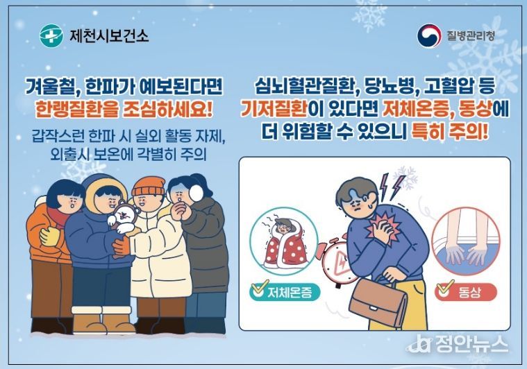 정안뉴스 황은경 기자 | 제천시보건소(소장 안순덕)가 겨울철 한파로 인한 건강 피해를 예방하기 위해 독거 어르신, 만성질환자, 거동 불편자 등 건강 취약계층을 대상으로 집중 건강관리를 추진한다.