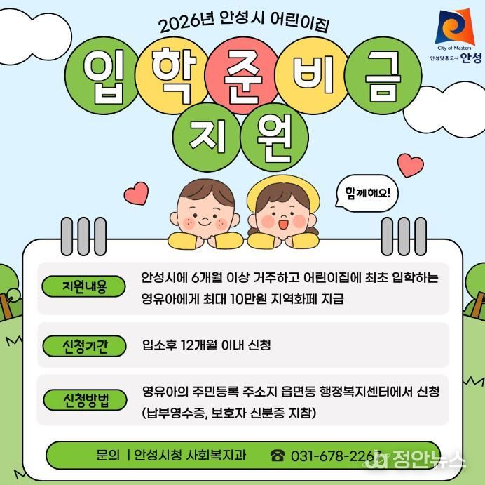 정안뉴스 안정주 기자 | 안성시는 2026년부터 어린이집 입학준비금 지원사업을 시행한다고 밝혔다.