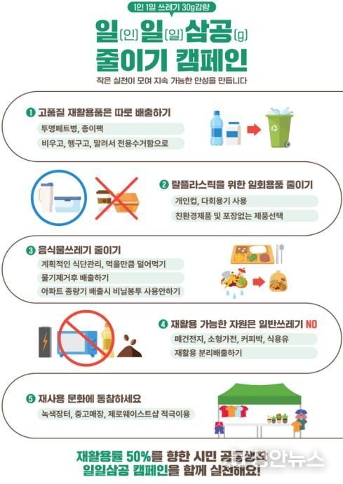 정안뉴스 안정주 기자 | 안성시는 시민의 자발적인 실천을 통해 재활용률을 높이고 생활쓰레기 발생량을 줄이기 위한 ‘1인 1일 쓰레기 30그램 줄이기(일일삼공) 캠페인’을 적극 추진하고 있다고 밝혔다.