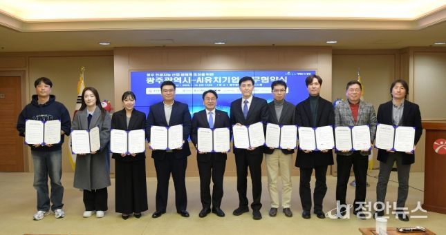 광주광역시는 16일 시청 비즈니스룸에서 제조·헬스케어 등 인공지능(AI) 전문기업 9개사와 ‘광주형 인공지능 비즈니스 업무협약’을 체결했다.