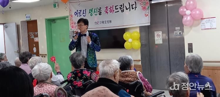 실제 이날 신광요양원에서 어르신 정서 지원을 위해 '찾아가서 함께하는 효사랑 잔치'를 열고, 율동과 웃음치료, 건강 박수 배우기 등을 진행했다.