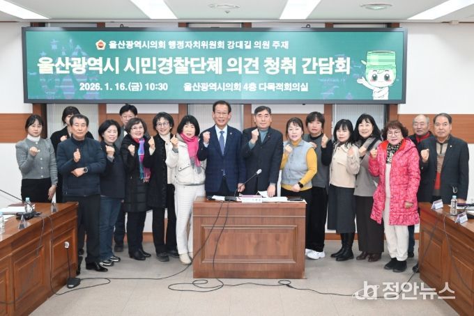 정안뉴스 안정주 기자 | 울산시의회 강대길 의원은 16일 의회 4층 다목적회의실에서 주민, 시민경찰단체, 경찰위원회ㆍ경찰청 관계 부서 등과 함께 ‘울산광역시 시민경찰단체 의견 청취’ 간담회를 개최했다.