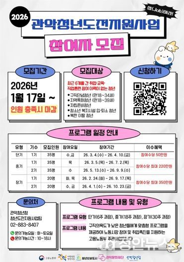 정안뉴스 안정주 기자 | 관악구가 구직을 단념한 청년들의 사회 진입을 돕기 위해 오는 1월 17일부터 ‘2026년 청년도전지원사업’ 참여자를 모집한다.