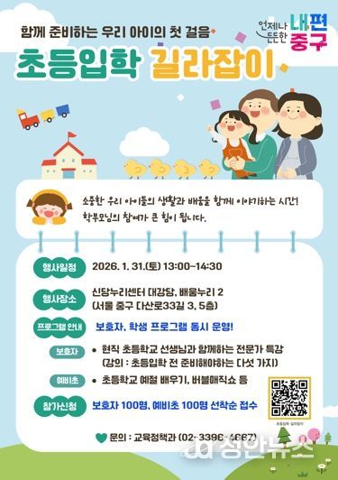 정안뉴스 안정주 기자 | 서울 중구가 ‘2026 초등입학 길라잡이’ 설명회를 오는 31일 오후1시부터 신당누리센터 대강당에서 개최한다. 예비 초등학생과 학부모를 대상으로 약 1시간 반 동안 현직 교사가 첫 학교생활에 대한 궁금증을 해소해 줄 예정이다.